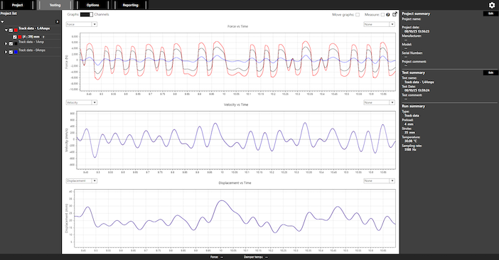 The software includes all essential shock dyno graphs and supports external sensors, allowing additional data to be displayed and analysed in real time. Depending on protocol (SYD or EMA), the software can also generate Chirp, Sweep, and Pink Noise waveforms for dynamic testing, as well as import direct track data.